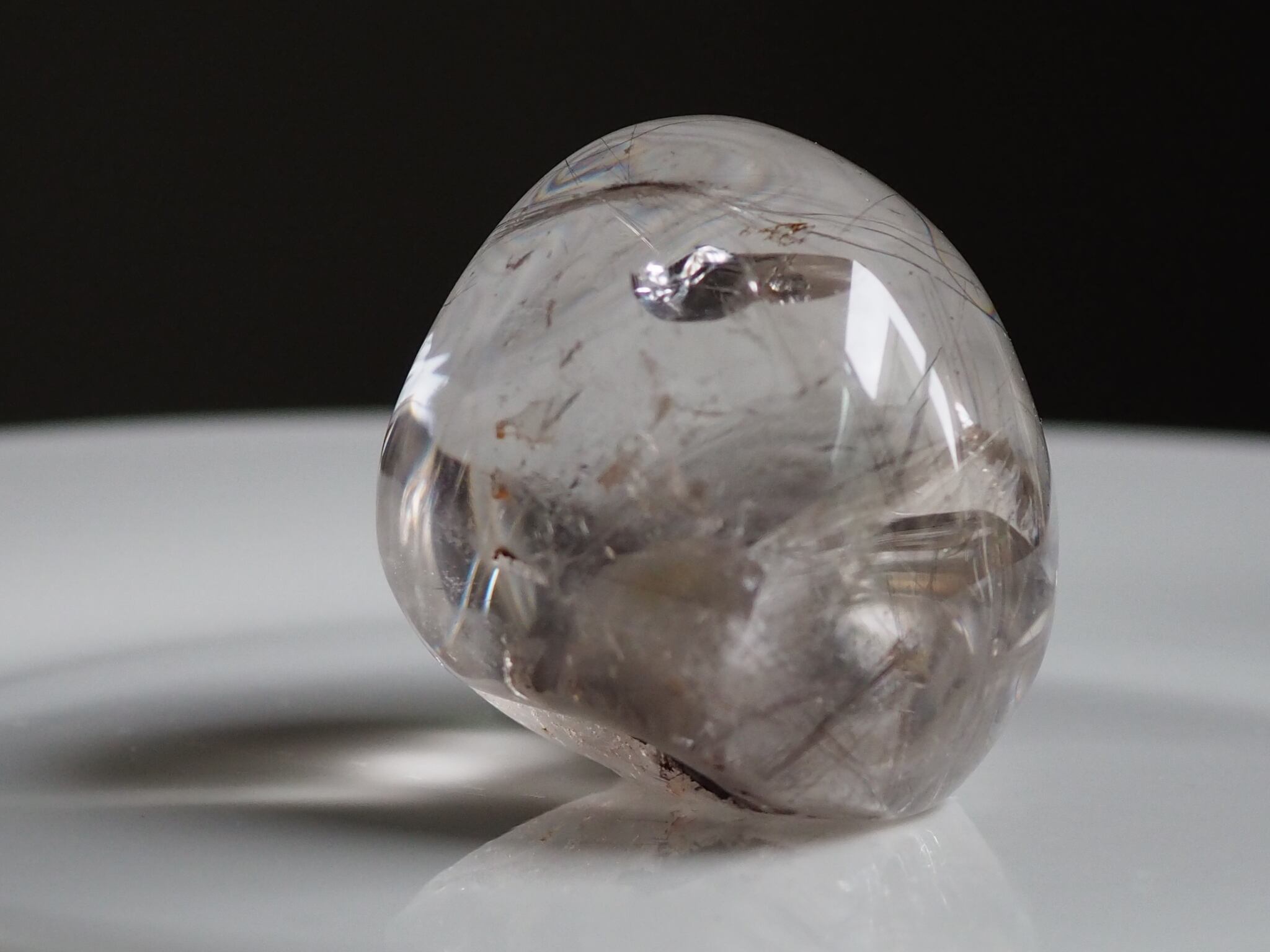 可愛い丸いフォルムにシルバーのルチルが入った水晶です。